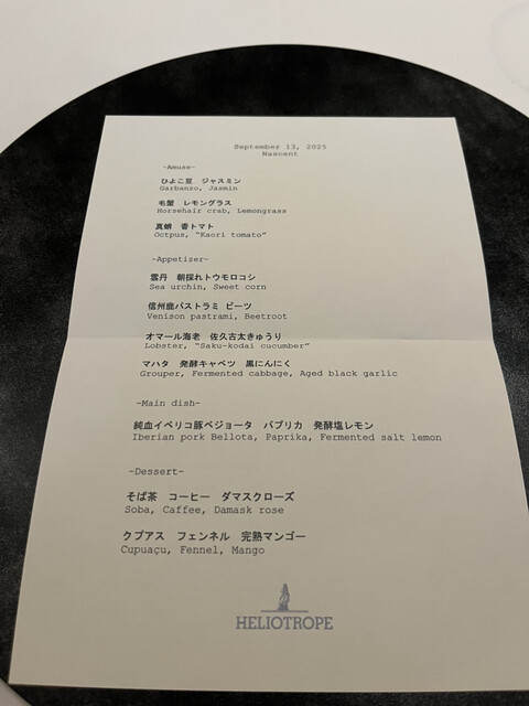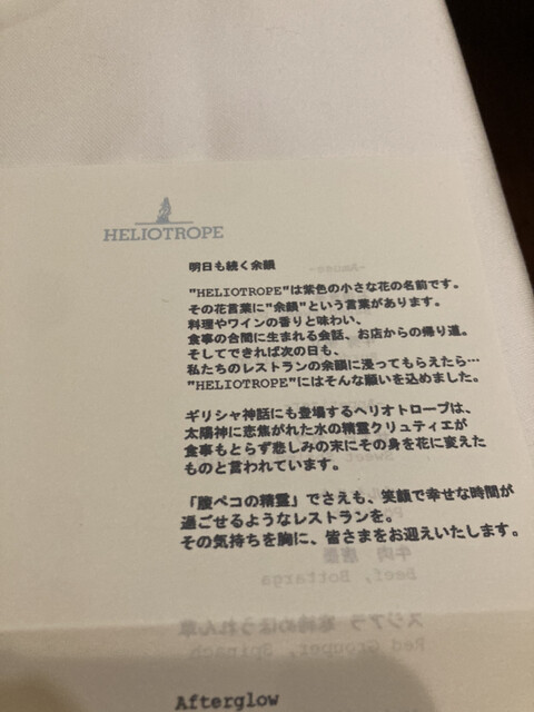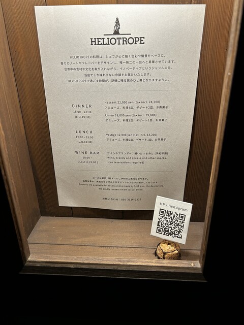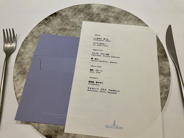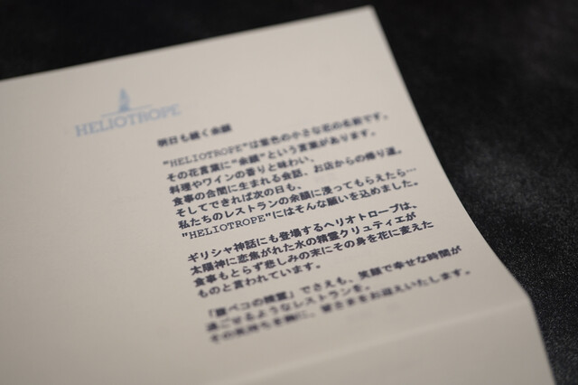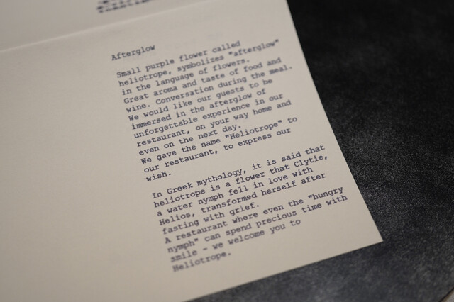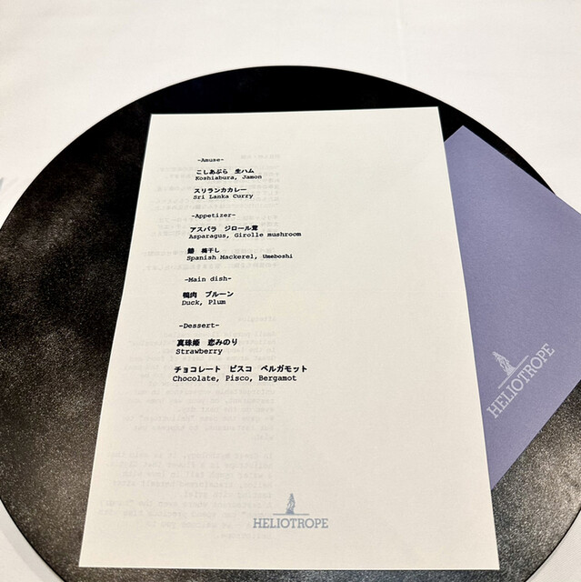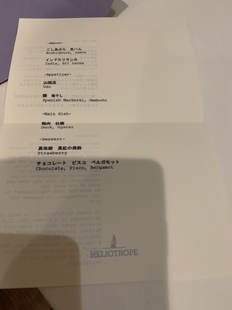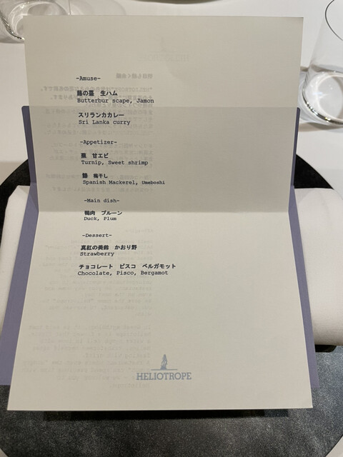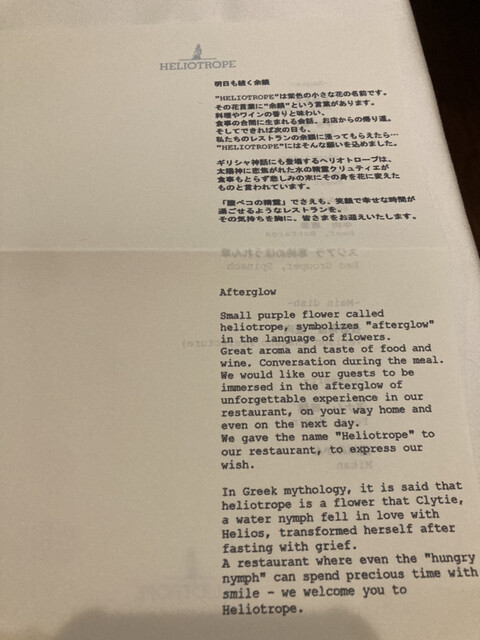 HELIOTROPE는 일본에서도 몇 안 되는 완전 무국적 혁신 레스토랑입니다. 요리와 와인의 향기와 맛, 식사 중에 나누는 대화, 가게에서 돌아오는 길, 그리고 다음 날에도 저희 레스토랑의 여운을 느끼셨으면 좋겠습니다… HELIOTROPE에는 그런 바람이 담겨 있습니다. 전직 시스템 엔지니어인 여성 셰프가 만드는 혁신적인 요리와 미슐랭 레스토랑 출신의 소믈...리에가 제공하는 음료와 서비스를 즐겨보세요.