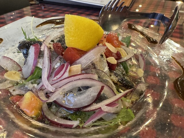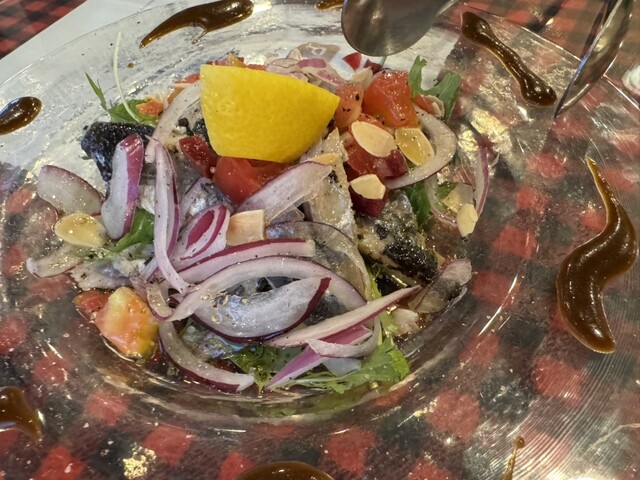 "아부리 산마와 매실 시소의 카르파초(세금 포함 2860엔)"… 꽤 많은 야채가 들어간 요리였습니다. 산마를 일부 섞어 야채를 먹는 느낌입니다. 샐러드의 일종에 가깝습니다.