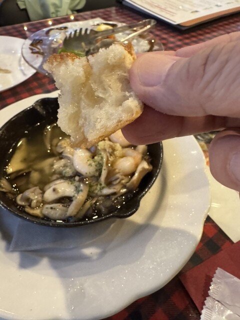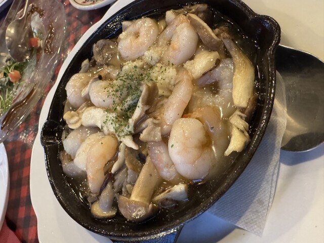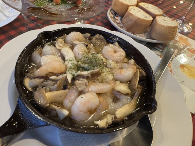 "작은 새우와 버섯의 아히요(빵 4조각 포함)(세금 포함 1900엔)"… 고추와 마늘의 간은 약한 편이고, 작은 새우의 쫄깃한 식감이 즐겁습니다.