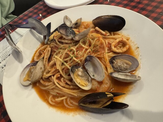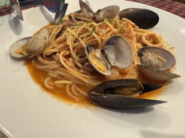 "페스카토레(세금 포함 2970엔)"… 토마토 소스 베이스의 어부 스타일 파스타입니다. 조개, 오징어, 새우, 홍합 등이 재료로 들어갑니다. 해산물 육수보다는 꽤 담백한 맛이 나고 있습니다.