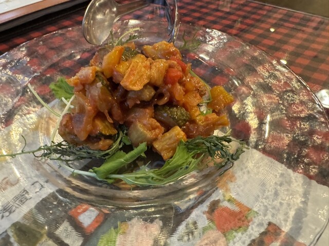 "카포나타(세금 포함 1210엔)"… 따뜻한 야채의 토마토 조림 가정식 요리입니다. 맛은 예상대로 진한 맛입니다.