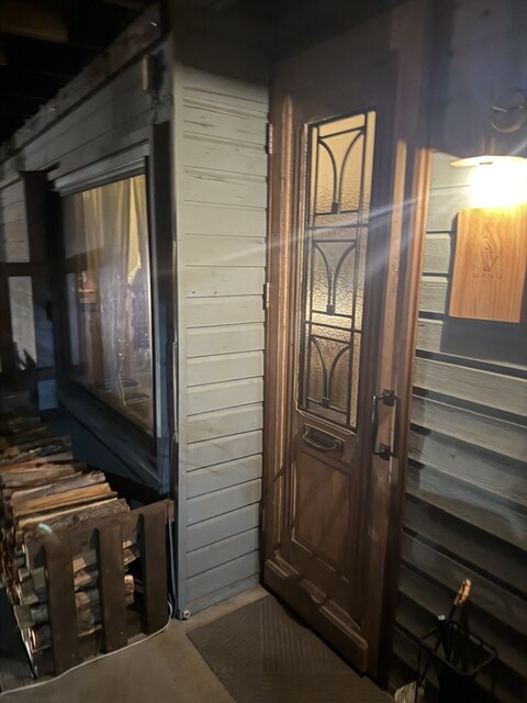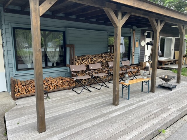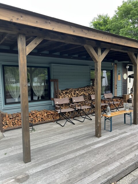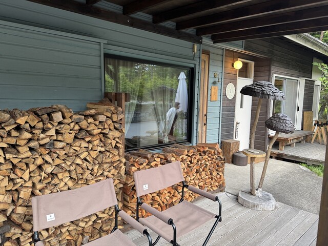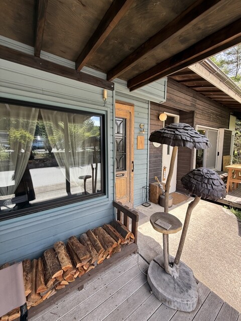가루이자와 레이크 뉴타운의 한 구석에 위치하고 있으며, 입구 근처에는 장작이 많이 쌓여 있습니다.