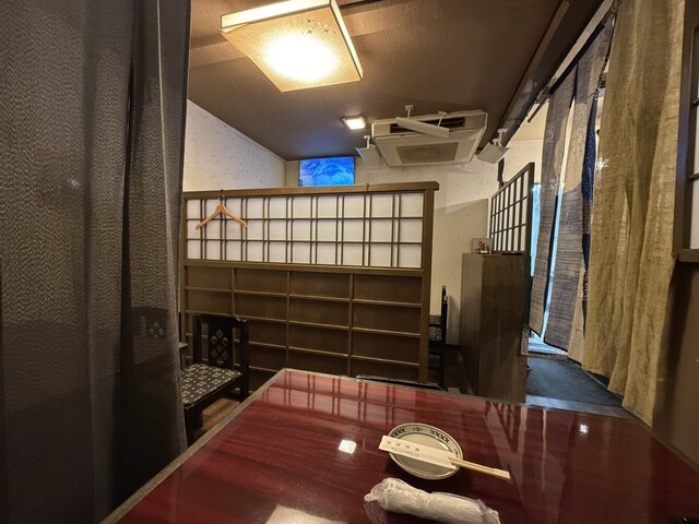 차분한 공간, 자리가 넓은, 좌식 있음, 일식 난방(코타츠; 마루청을 뜯어 그 위에 설치한 열원을 갖춘 밥상)있음. |