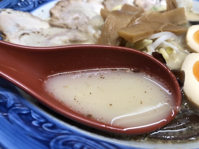 スープは濃厚な豚骨ベース。表面には香ばしいマー油(焦が...