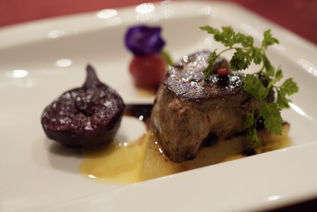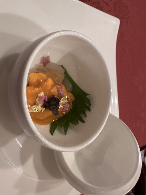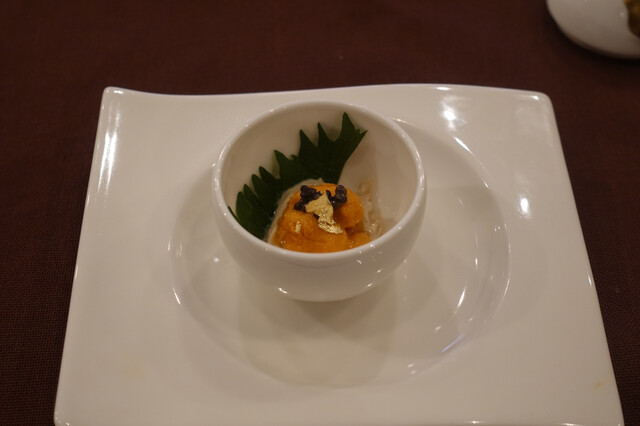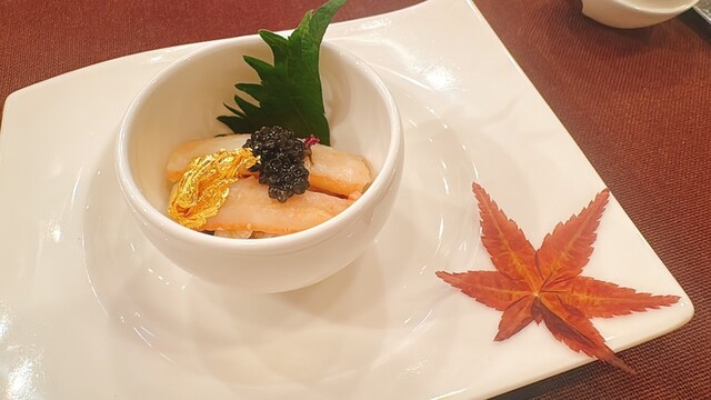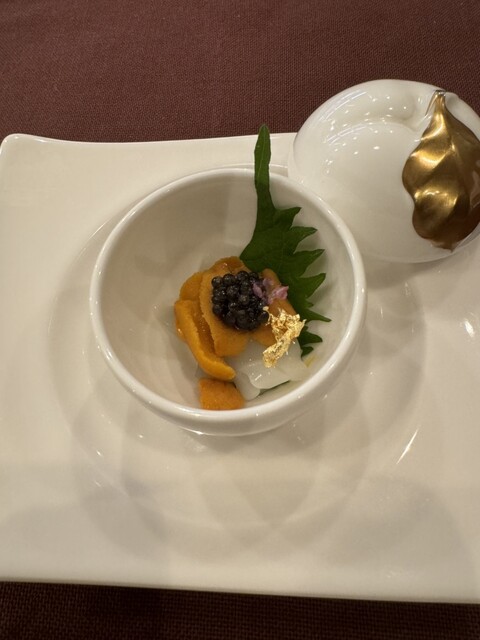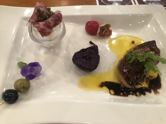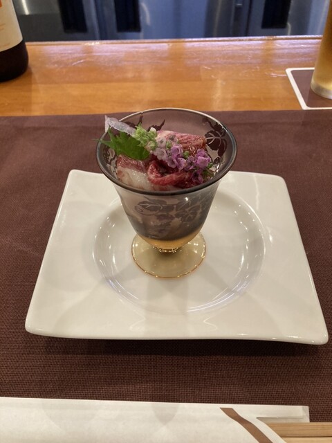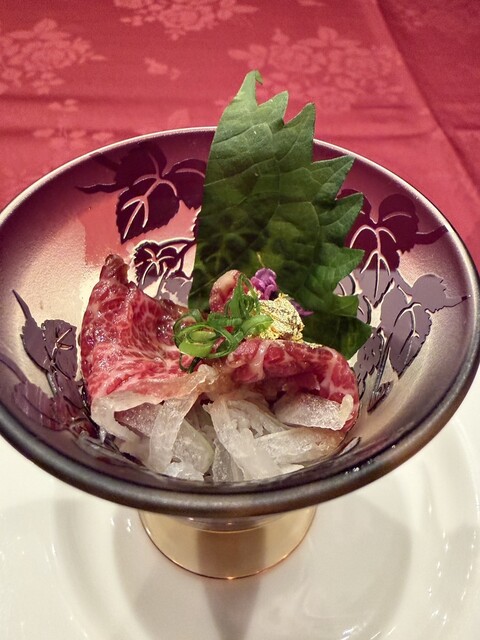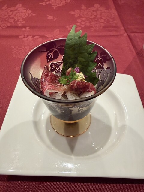 まずグラスに注がれたのは、ピノ・ノワールの芳醇な香り。コースの幕開けを飾るのは、金箔をあしらった贅沢な馬刺しです。ほんのりとした甘みのある醤油ダレ...