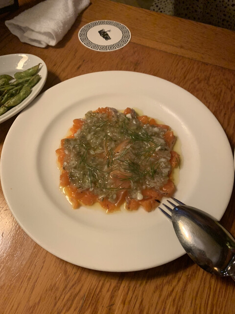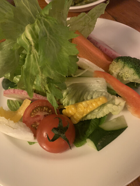 素揚げはからっと揚がっていて香ばしくいいですね。カルパッチョはサーモンでした。サーモンは妻もあまり好きではないようでいまいちでした。バーニャカウダは当たりでした。新鮮な野菜で美味しかったです。