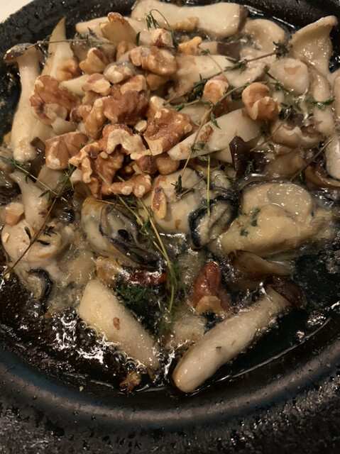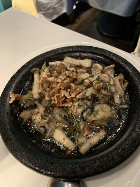 早速注文です。私はハイボール、妻はスパークリングワインにしました。お腹は前のお店である程度満たしてきたので注文は2品だけにします。広島カキとクルミ、キノコのアヒージョとマルゲリータにしました。