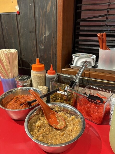 こってり背脂ラーメンを注文し、まずはニンニク味噌をガツンと投...