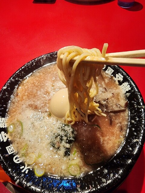 超濃厚でコク深い豚骨スープに背脂がたっぷり絡んだ一杯が特徴で、麺は中太ストレートで存在感あり。