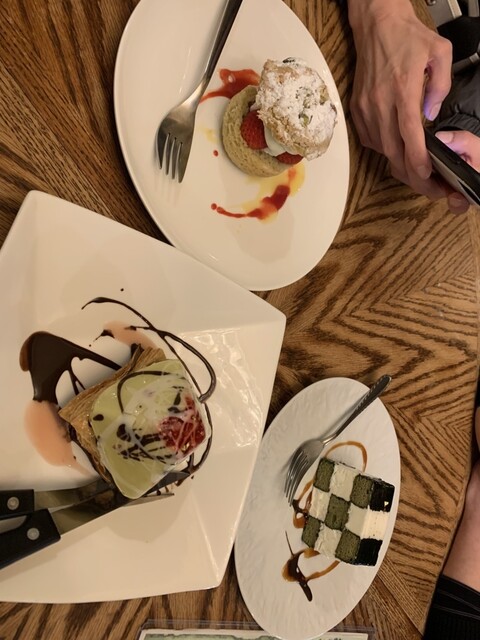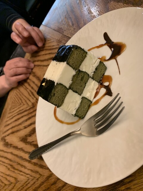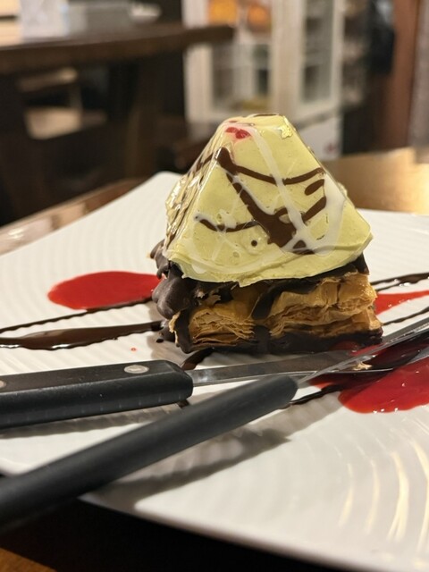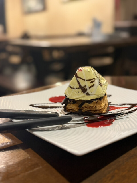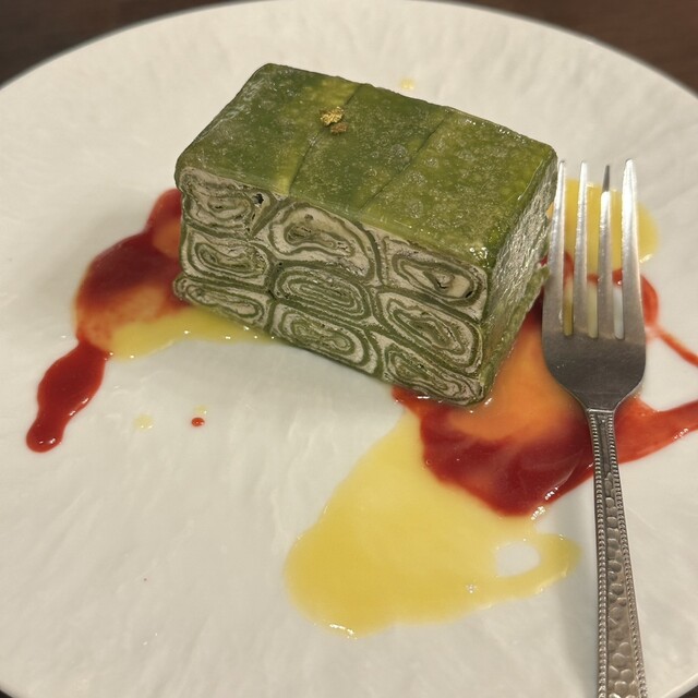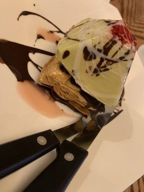 友人のピスタチオクリームのムースの底にパイ生地がついているものを。