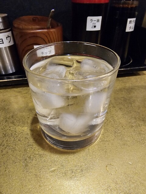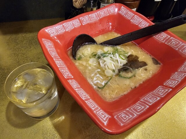 熊本の繁華街で24時間営業している黄金ラーメンさんを朝に訪問。こちらで朝ラーするのは麺友さんの真似です。オーダーはかけラーメンの中から、かけくまもとラーメンと白岳の水割り。すぐに水割りが提供され乾杯です。そして、麺が着丼です。
