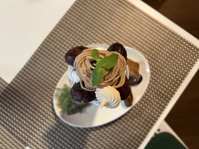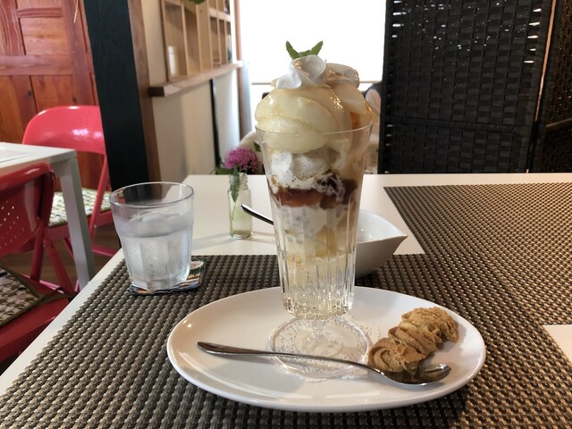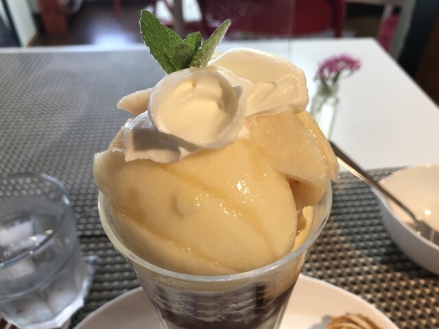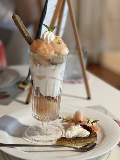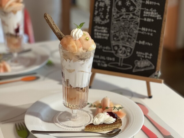 チャイアイスクリーム、ベリーソースパイ、桃シャーベット、紅茶シフォン、桃のコンポートゼリーなど、盛りだくさんな内容。器にはマスカルポーネクリームタルトと生桃も。