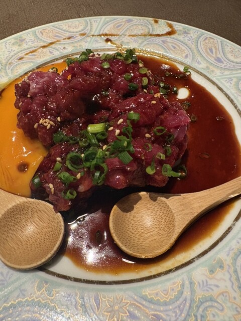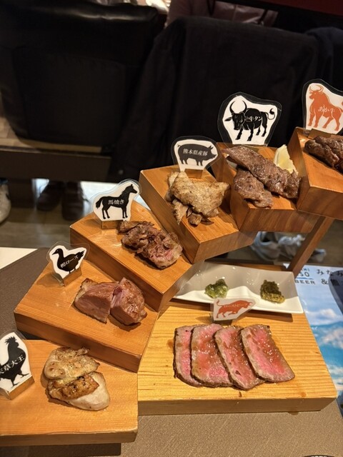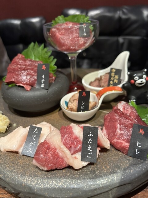 阿蘇山盛り合わせという推しメニューの盛り合わせを頼みました。ヒレ馬刺し、はらみ馬刺し、ロース馬刺し、たてがみ、ユッケ、うまわさ、一文字ぐるぐる、辛子蓮根、馬肉中落ちカルビ炙り、あか牛ステーキ、あか牛ロ...