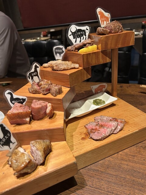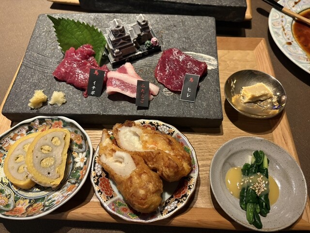 会社の忘年会で訪問しました。このお店は馬刺し、赤牛、鶏肉のブランド天草大王、豚肉まで熊本特産肉のオンパレードで楽しめます。肉の階段と馬刺しのレバー、焼き鳥盛り合わせ、海葡萄などなどお酒、特にワインとマ...