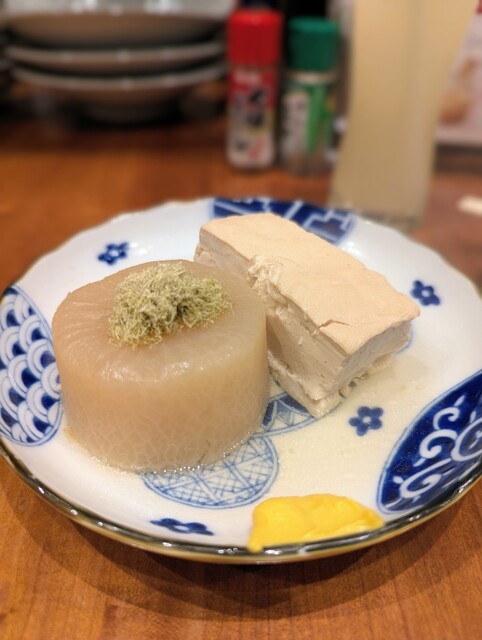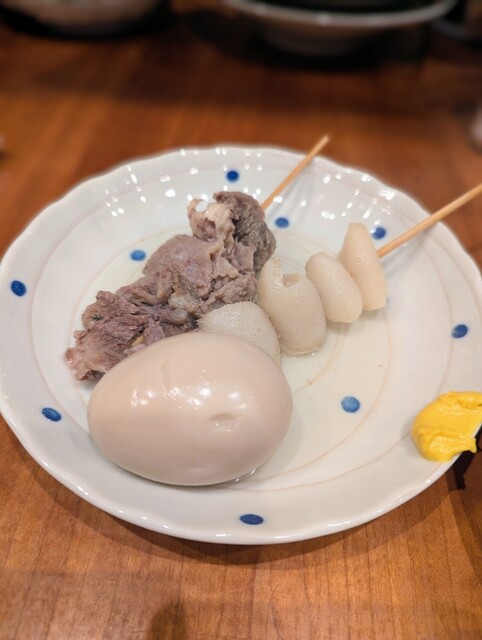 おでんの具材としては珍しい、絶妙な火加減の半熟たまごが提供されます。とろりとした黄身と塩だしが絡み合い、シンプルな具材ながらも深い満足感を得ることができました。おでんで半熟たまごをいただけるという点も、嬉しい驚きでした。