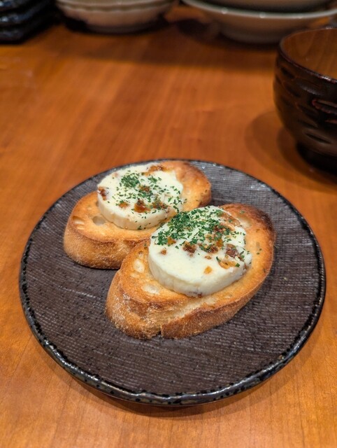 香ばしく焼かれたバゲットに、いちじくが練り込まれた濃厚なバター(またはチーズ)が乗せられた、洋風のおしゃれな一品です。濃厚なコクと芳醇ないちじくの風味が、おでんの合間の箸休めや、ドリンクのお供としてぴったりでした。