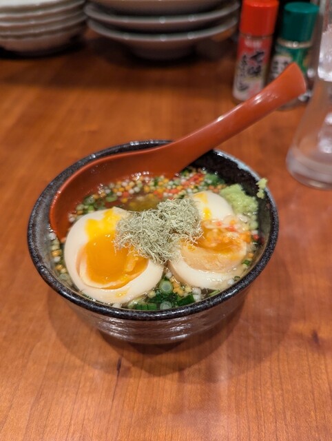 〆に注文したこのお茶漬けは、具材が半熟たまごととろろ昆布という、初めて体験する組み合わせでした。特製の塩だしスープをベースにしたお茶漬けは、胃にやさしく、半熟たまごやとろろ昆布が出汁の風味と相まって、〆にふさわしい深い味わいでした。
