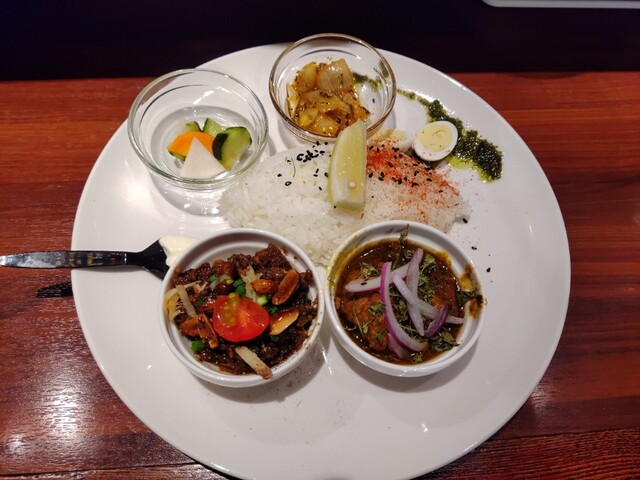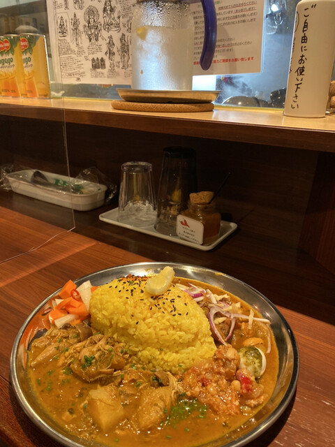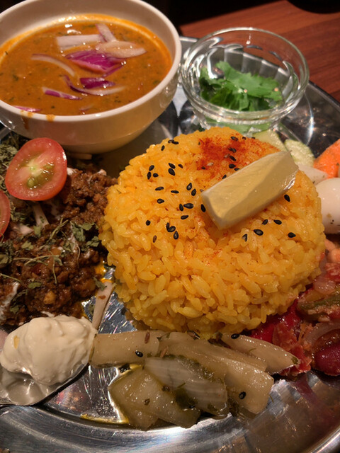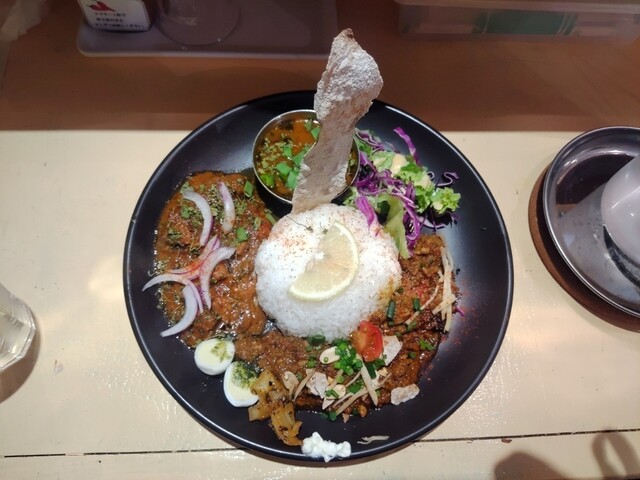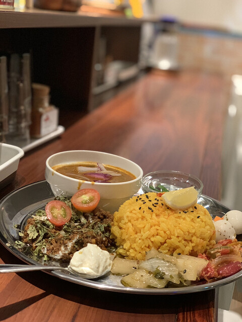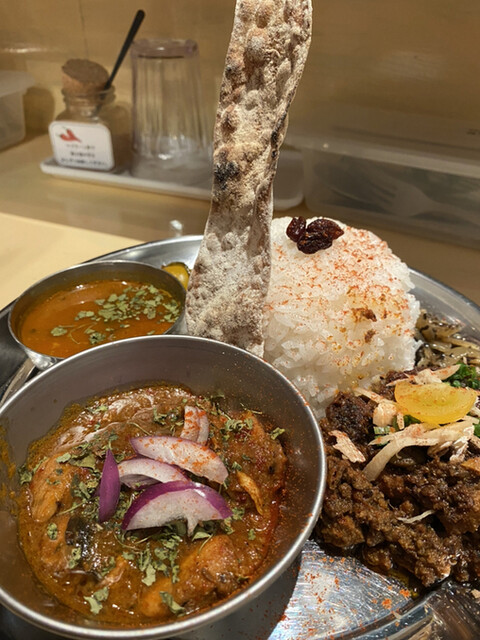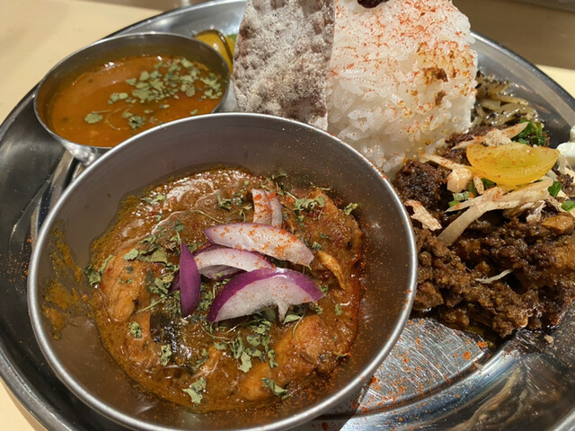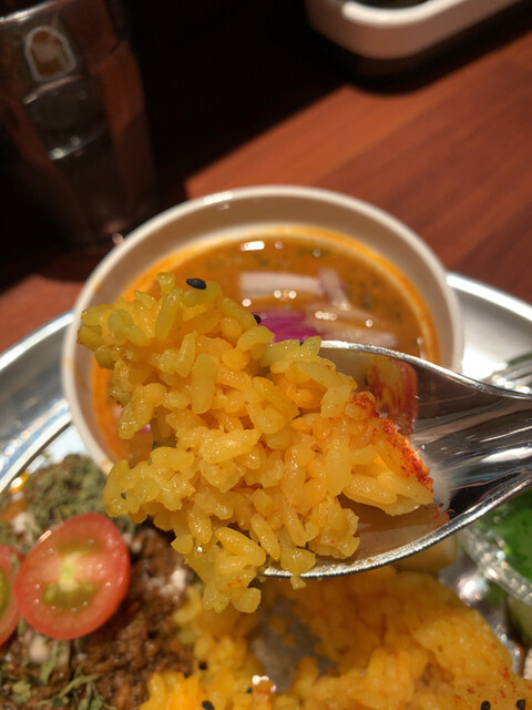 キーマとチキンマサラのカレーはたくさんのスパイスを使われてそうです。トマトのスープも酸味を感じて美味しかったです。