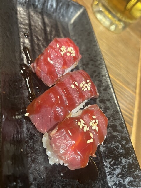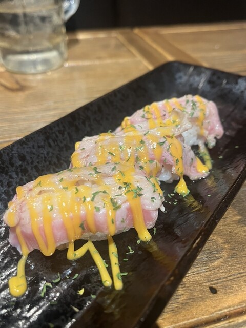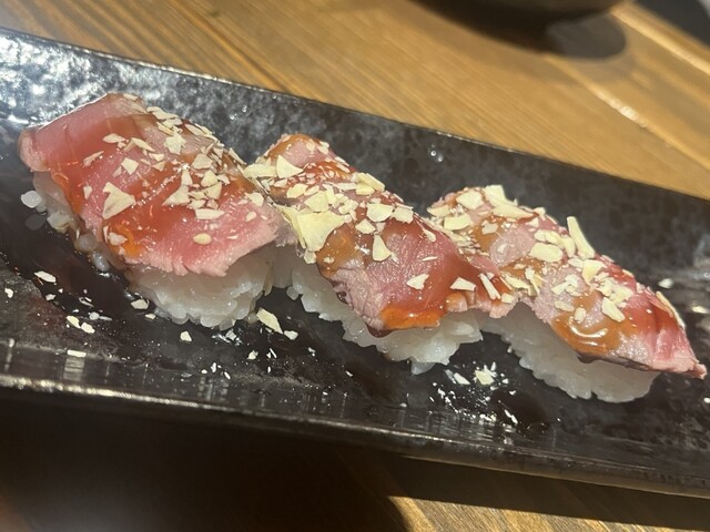食べログパトロール中に見つけた びっくりコスパのお店! メニューがたくさんありますが おかわり二回以上したオススメは ◆和牛肉寿司 めちゃくちゃレアな絶妙な具合で火入れがされている、とろける脂ののった肉寿司!! 焼肉屋のバウンドご飯がもう一貫に完結している素晴らしいお料理です(笑... 詳細を見る