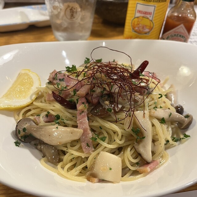 きのことベーコン。細麺のアルデンテ。味は普通。
