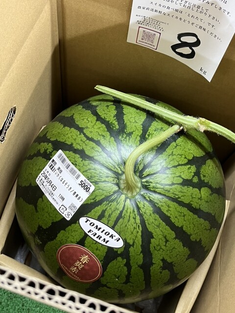 久々こちらまで伺って実家送付用と自分達で食べる用のスイカを購入しました。 今回購入したのは黒BON BONリッチという少し小ぶりな黒玉スイカ。 一晩冷やして頂きました。 包丁... 詳細を見る