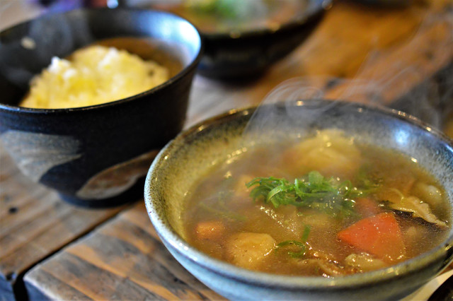 まず、漬物と、小鉢に切り干し大根、春菊、椎茸とかぼちゃの煮物を出していただいて,こちらは優しい味付けで特に切り干し大根が美味しかったです。次に写真にはないですが,揚げたての揚げ豆腐を...
