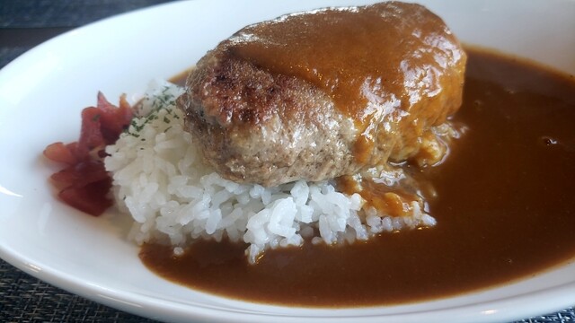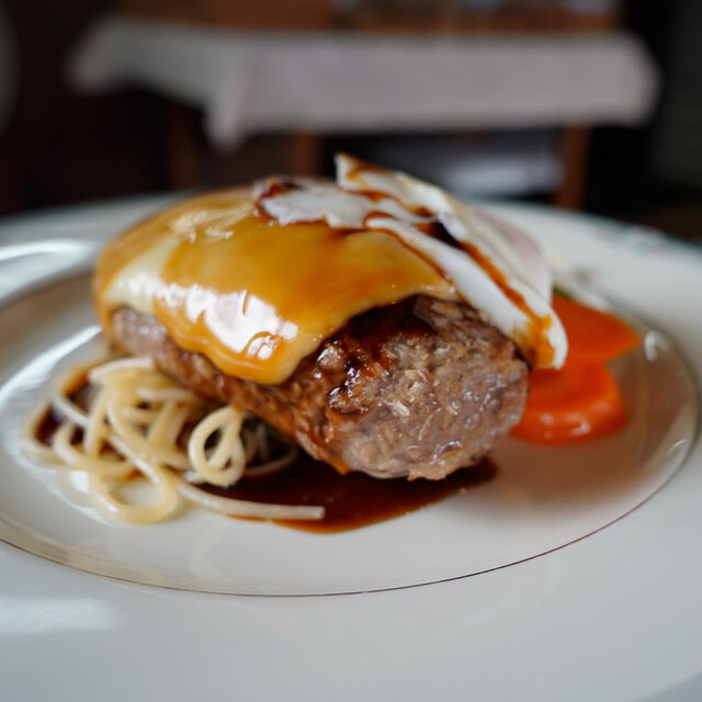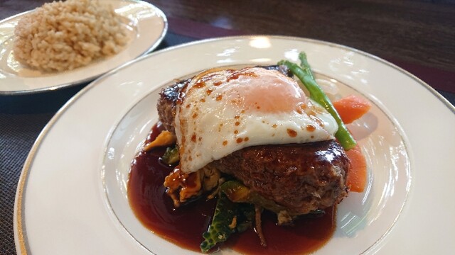オーダーしたのは人気の「赤牛ハンバーグ」。オプションの地鶏目玉焼きとゴーダチーズのWのせでお願いしました。