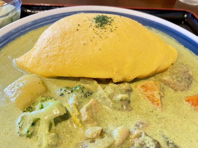 産山村の人気店「山水亭」で、名物のグリーンカレーオムライスをいただきました。