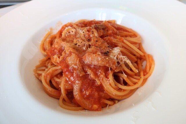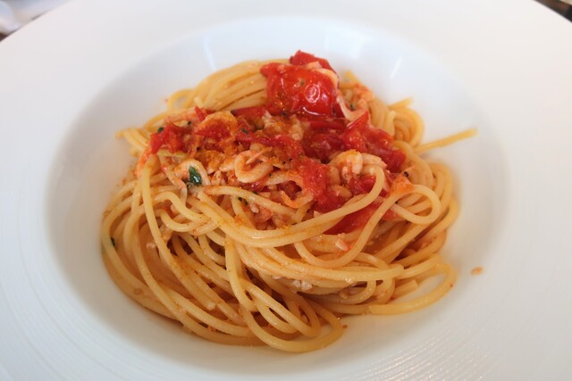 メインはプラス料金で注文できるピッツァD.O.Cと、パンチェッタととうもろこしのカチョエぺぺスパゲッティを注文してシェア...