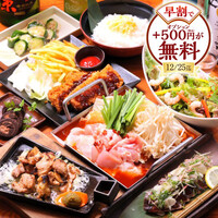【2時間飲み放題付き】早期予約でお得!11月13日~12月25日の日曜~木曜日は「飲み放題2H⇒3H」or「飲み放題グレードUP」の+500円のオプションが無料!更に忘年会の演出をお手伝い♪「横断幕特典」「寄せ書き焼酎ボトル」をご用意♪(4日前迄のご予約)。軍鶏たたき風3種盛合わせや軍鶏屋の水炊き、浪花の豚串カツなど、人気メニューが勢ぞろい。〆までおいしく楽しめる全10品をご堪能ください!
