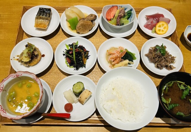 ここの名物ランチは京都おばんざいが10皿並ぶお料理と釜炊きのご飯で食べるランチです。