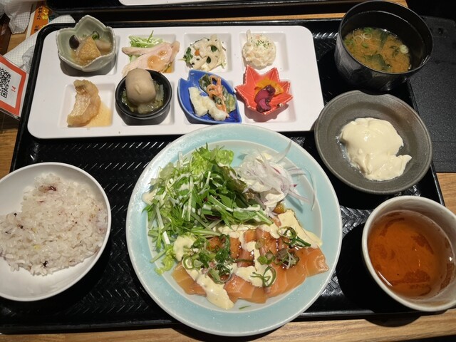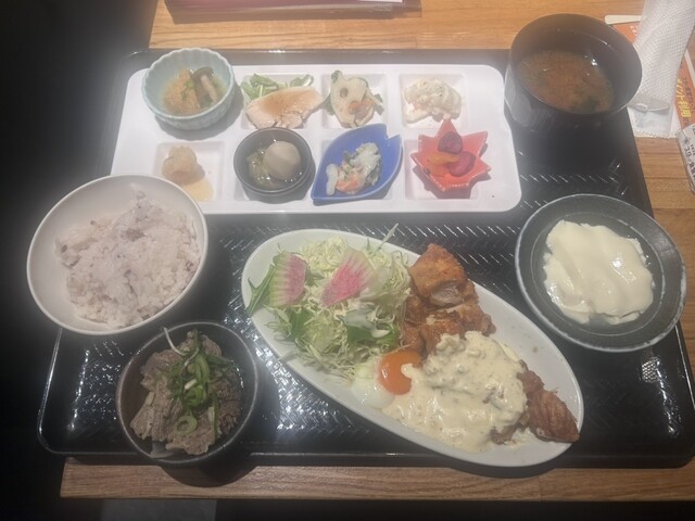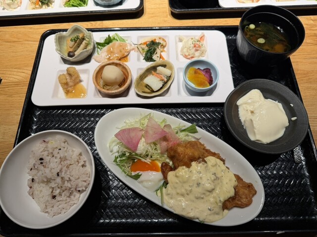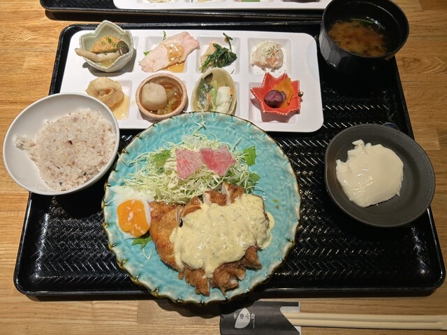 チキン南蛮おばんざいランチ(1199円)…とにかくおばんざいが全体的にどこか懐かしくなるような味で、特に野菜の歯切れというか食感が良く味もしっかりついていておいしい。
