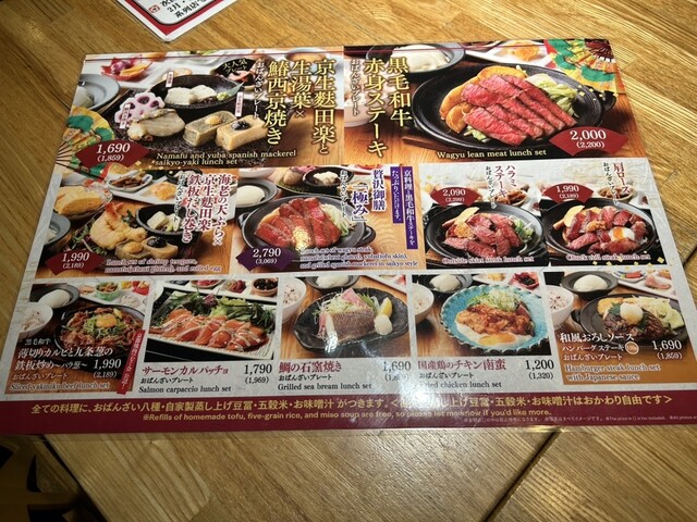 平日のランチにお伺いしました。ランチの定食価格は¥1,200〜3,000程の差があります。お米と豆腐と味噌汁はおかわり自由になります。どの定食も美味しそうです次回はステーキなども食べたいと思いました。