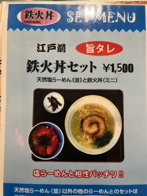 塩ラーメン一本勝負の名店に来ました。ついでにマグロ好きなので鉄火丼も付けてしまいました。