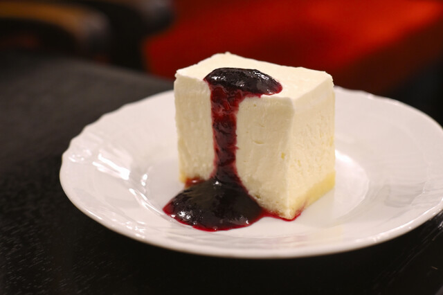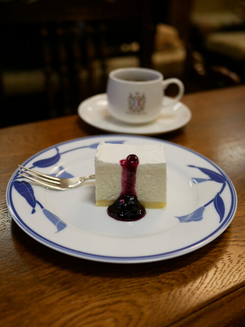 壁にさりげなく掛けられた絵画や内装は、まるで美術館のような空間。そんな中でいただくレアチーズケーキは自家製。ブルーベリーソースが添えられたレアチーズは、甘酸っぱいシンプルな味わいが美味。コーヒーとも相性◎。ほかにもプリンやしっかり焼き上げたケーキもそろう。