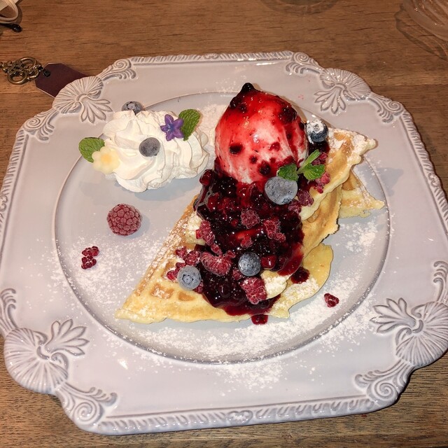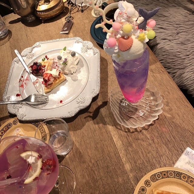 扉を開けるとそこは現実とは切り離された世界。 アンティーク調度品が生み出すラグジュアリーな雰囲気と圧巻の世界観の中でゆるやかに流れる時間をお楽しみください。 当店自慢の米粉ワッフルは原料を国産にこだわり、甘さ控えめでとってもヘルシー。ひとつひとつ丁寧に焼いて見た目にもこだわっています。魔法の青いハーブティー、バラの花びらで溢れる紅茶など、一味違ったオリジナルの紅茶やハーブティーなどもたくさんお楽し...みいただけます。