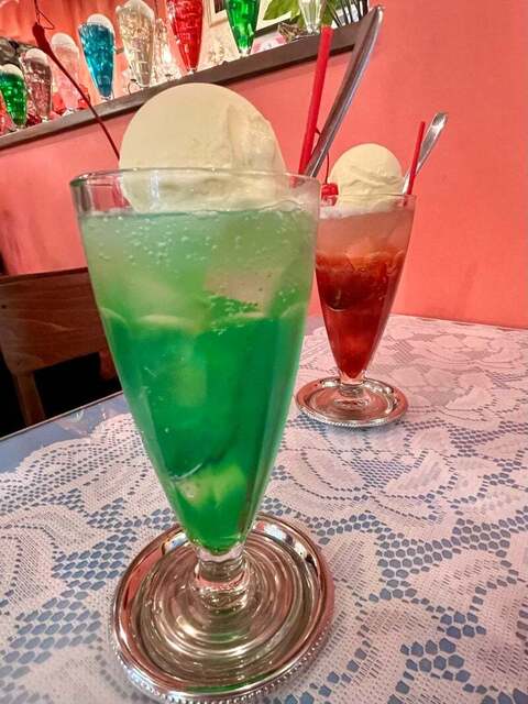 こちらは色んなクリームソーダも有名。フレーバーいっぱいある〜グラデーションも同価格でできます。