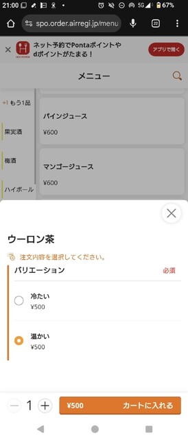 何にしようか迷いましたが、ソフトドリンクを見ると烏龍茶があり、