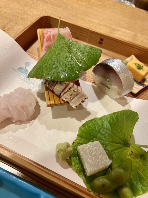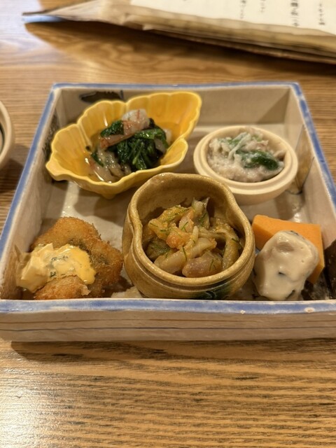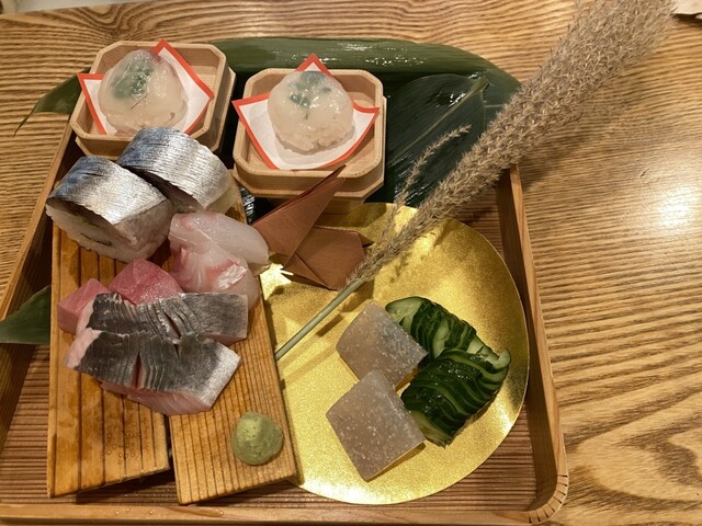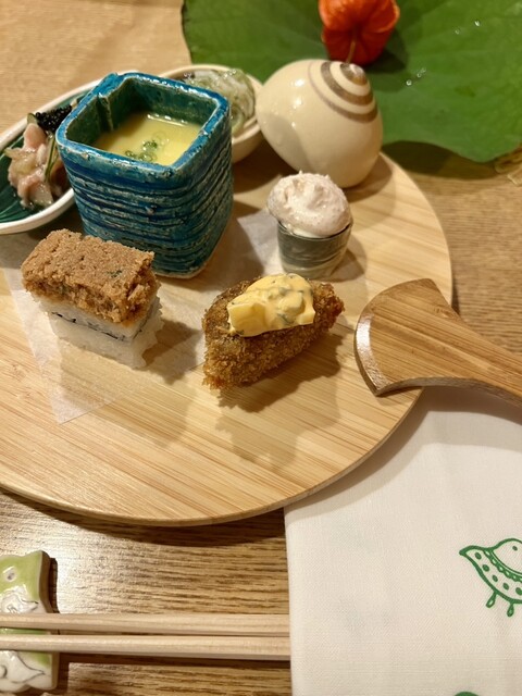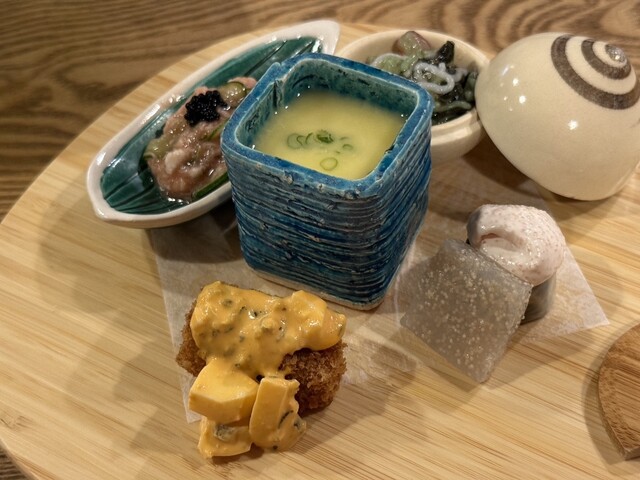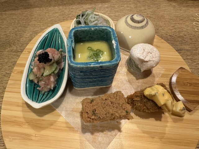 八寸(鯛の白子九条ネギの和え物、卵カステラ、きのこを練り込んだチーズ、舞茸と赤貝の雲丹和え、鱧カツ、海老とクラゲほうれん草の和え物)