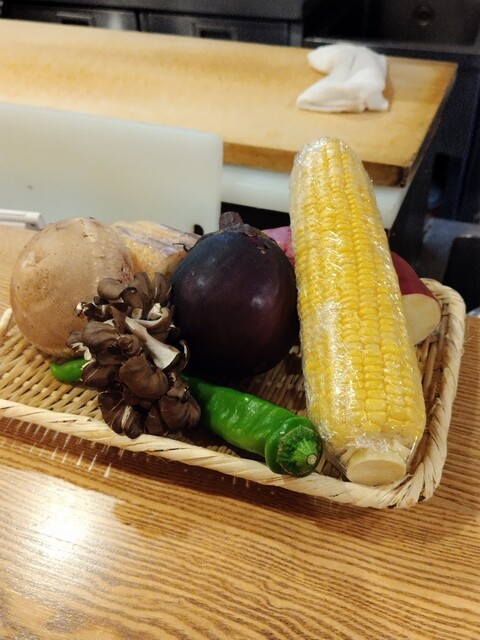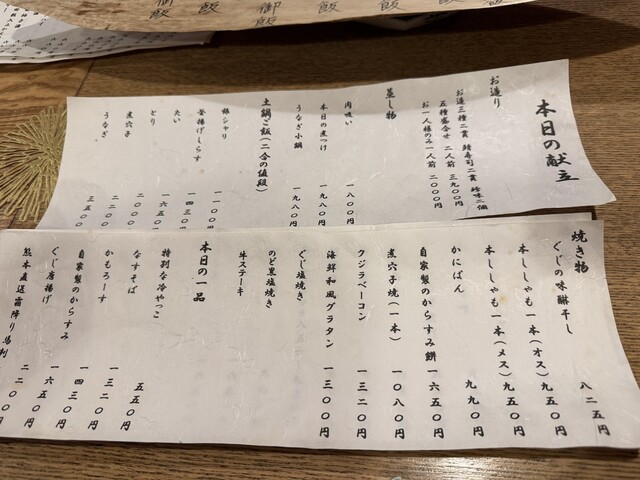 カウンターに着席。紙に書かれているメニュー以外の品を素材を見せながら説明を受けます。