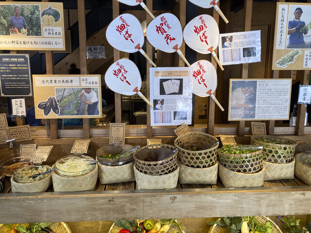 京都野菜を売りにした、リーズナブルなブッフェ。野菜コーナーではカットされた野菜が並び、好きなだけ取ってドレッシングなどをかけて食べられるようになっている。その他、うどんコーナーやカレーコーナー、さらには揚げ物台なども設置されている。