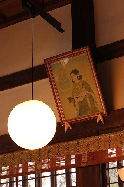 土曜日のオープン前、先に仏光寺を参拝します。時間になりお店に入店。入り口で靴を脱ぎます。畳のお部屋は中央に大きなお仏壇。元はお寺のどう言った建物だったのかなぁ。