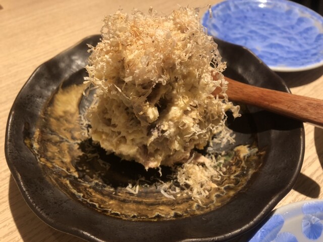 お酒は仙禽雪だるまと菊姫にごり酒を。追加で鳳凰美田、早瀬浦。今回のお椀は前回と同じく海老芋かに身とかぶら蒸し。お料理は、かつおのポテサラ、塩辛ぽてと、えびいものから揚げ、白魚天ぷら、丸大根と牛すじのたいたん、おでん大根天ぷら。最後はじゃこ飯で締めました。