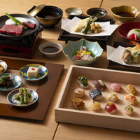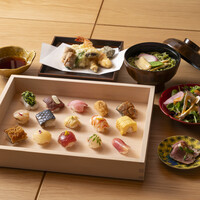 四季折々の素材を繊細に仕上げた、京都の味わいを堪能できる〈賀茂〉コース。 彩り豊かなおばんざい盛合せに始まり、なめらかな口当たりの汲み上げ湯葉のお刺身、旬の食材を軽やかに揚げた天ぷら皿など、一品一品に職人の技が光ります。 メインの手毬寿司15貫は、見た目も華やかで女性にも人気。赤だしと季節の甘味で、上品な京の食の余韻をお楽しみいただけます。 手毬寿司は+1,320円(税込)で大箱(30貫)にサイズアップできます。 ※写真はイメージとなります。