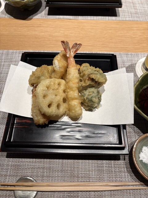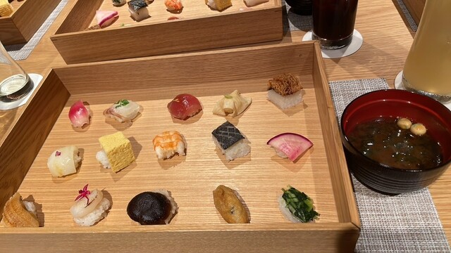 おばんざい盛り合わせ、お刺身、天ぷら皿、手毬寿司(15貫)、赤だし、甘味。