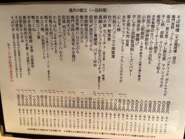 蕎麦前は、師走の献立(一品料理)から、そばがき¥1,650、自家製からすみ¥1,320。京都の日本酒は、玉川一合¥990 熱燗。からすみは、注文してませんが蕎麦に粉がかかったものより、たぶん一品料理...