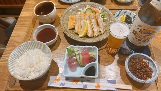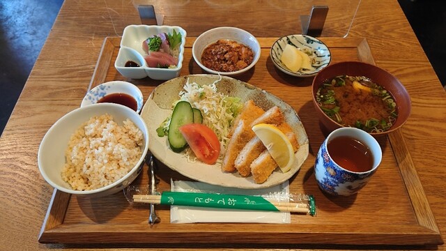 日替り定食(初かつおたたき香味ソースがけ) 西陣の和惣菜主体の定食屋さん。日替りのメインディッシュに好きな惣菜を2種選択できる。蓮根のきんぴらと青菜の白和えをチョイス。ご飯の... 詳細を見る