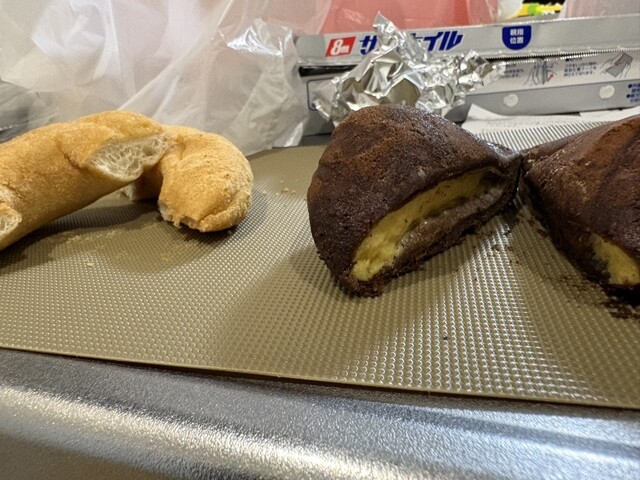 写真手前が抹茶クリームチーズ、奥が黒豆粒あんです。メモに書かれたとおりオーブントースターで温めると、もちもちで特に黒...
