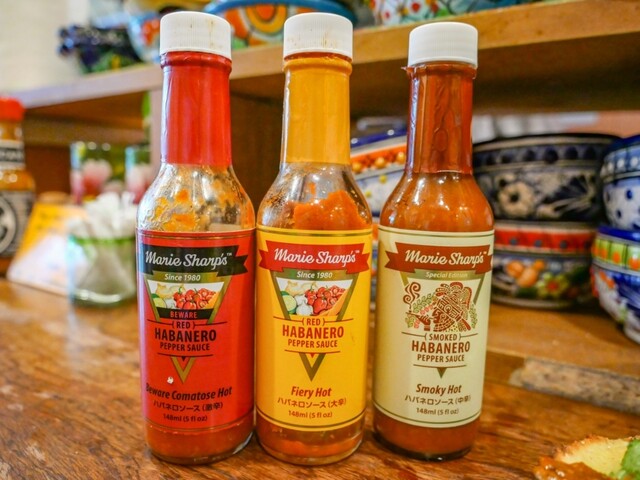 卓上に辛いメキシカンソースが3種類。