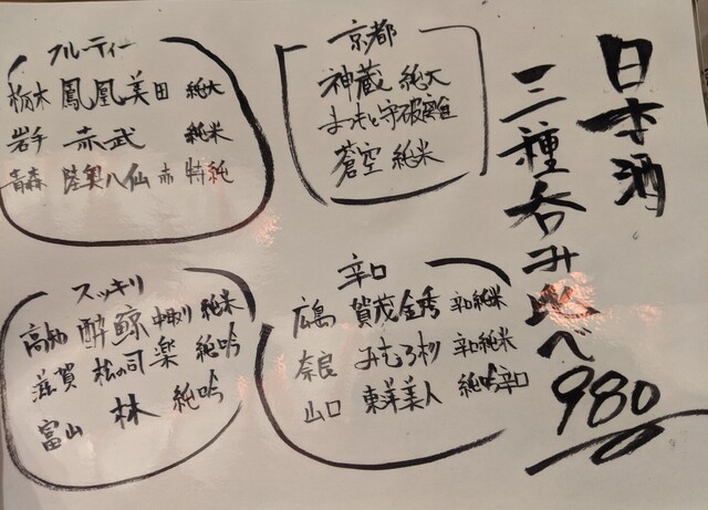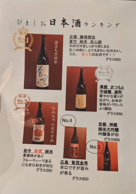 | ドリンク | 日本酒あり、焼酎あり、ワインあり、カクテルあり、日本酒にこだわる |